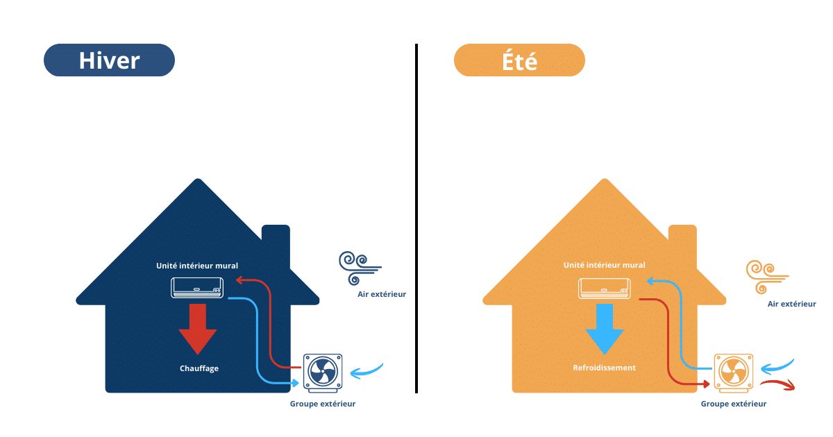 L’atout majeur de la pompe à chaleur air-air réside dans sa capacité à fonctionner en mode chauffage ou climatisation, selon les besoins. En hiver, elle capte les calories de l’air extérieur pour réchauffer votre intérieur, tandis qu’en été, elle évacue la chaleur superflue pour rafraîchir les pièces.